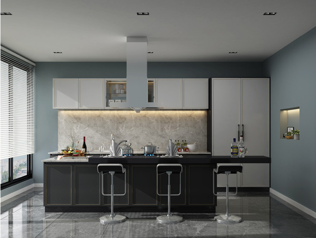 厨房改用玻璃隔断空间,增加空间通透性、采光线,配合乳白色橱柜设计,超强的采光增强了空间格局的开阔感,得体的布局充分考虑了人体动线,给日常烹饪带来许多便利。