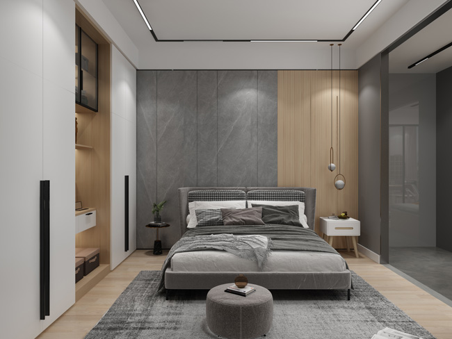 一个温馨+颜值的卧室标准是什么?整个卧室空间木格栅+软包做背景墙,配合浅咖色的大床,好看又精致的同时,不至于落入千篇一律的雷同。主卧空间利用原木设计梳妆台,搭配圆镜和打光灯,让女主人精致的美美美~