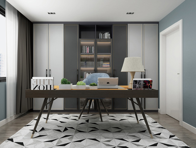 书房设计展示架作为书架,收纳和颜值兼具。落地式的窗户,增加室内采光,让书房更显舒适。